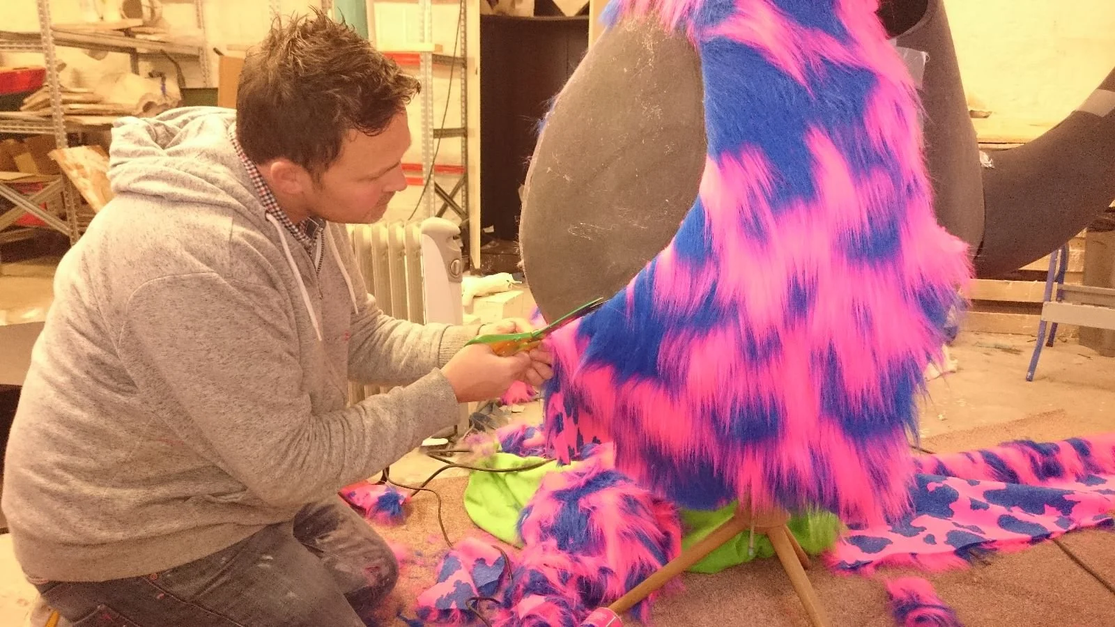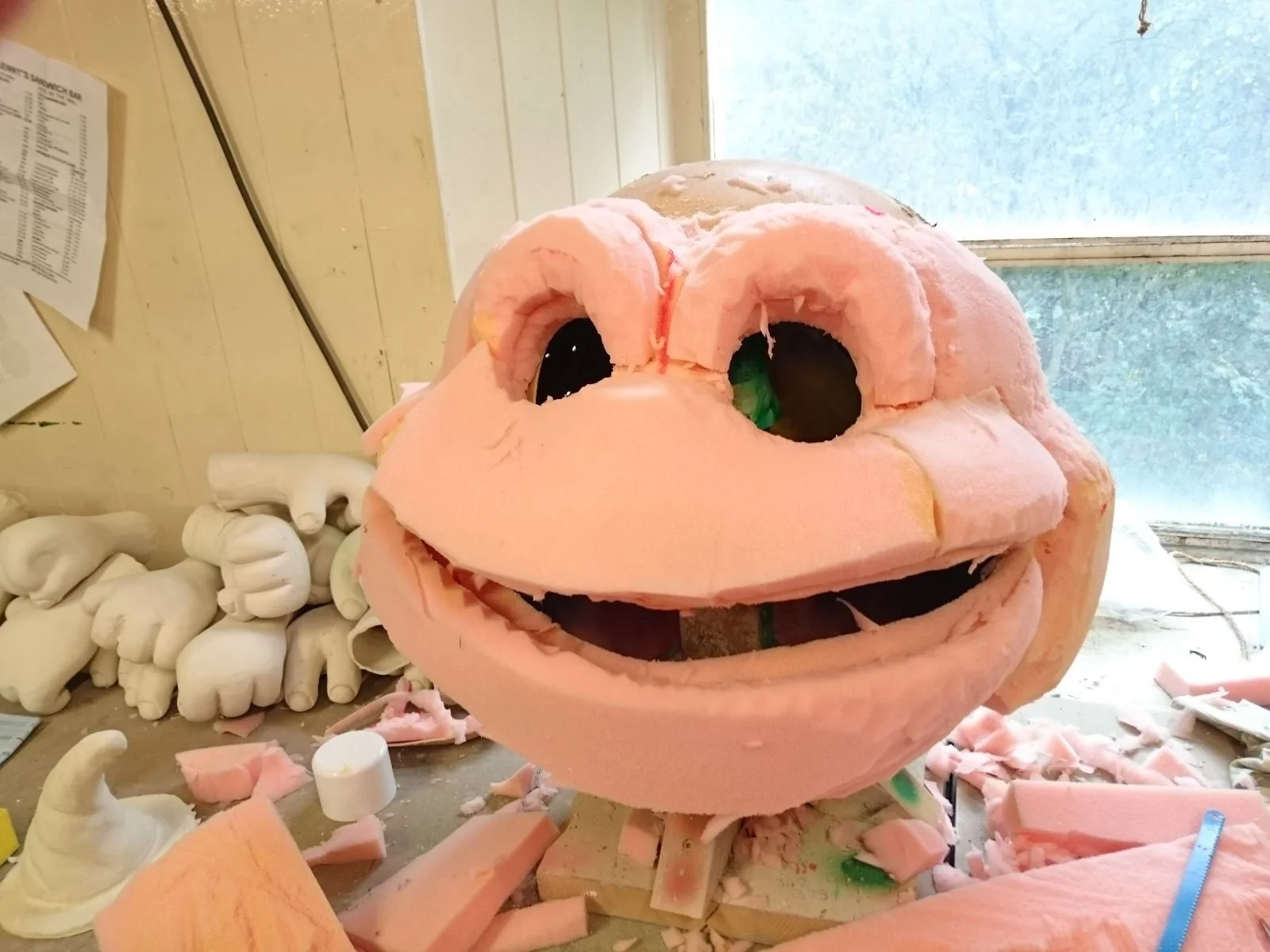 My skills from many years of mascot creation, enabled me to create this fun and friendly costume by firstly creating fabric and plastazote patterns , then carefully from an ABS vac form, I carved the head from foam. The feet are made from carving foam around the base of a moon boot then from my shoe patern, carefully sewing this onto the shoe.