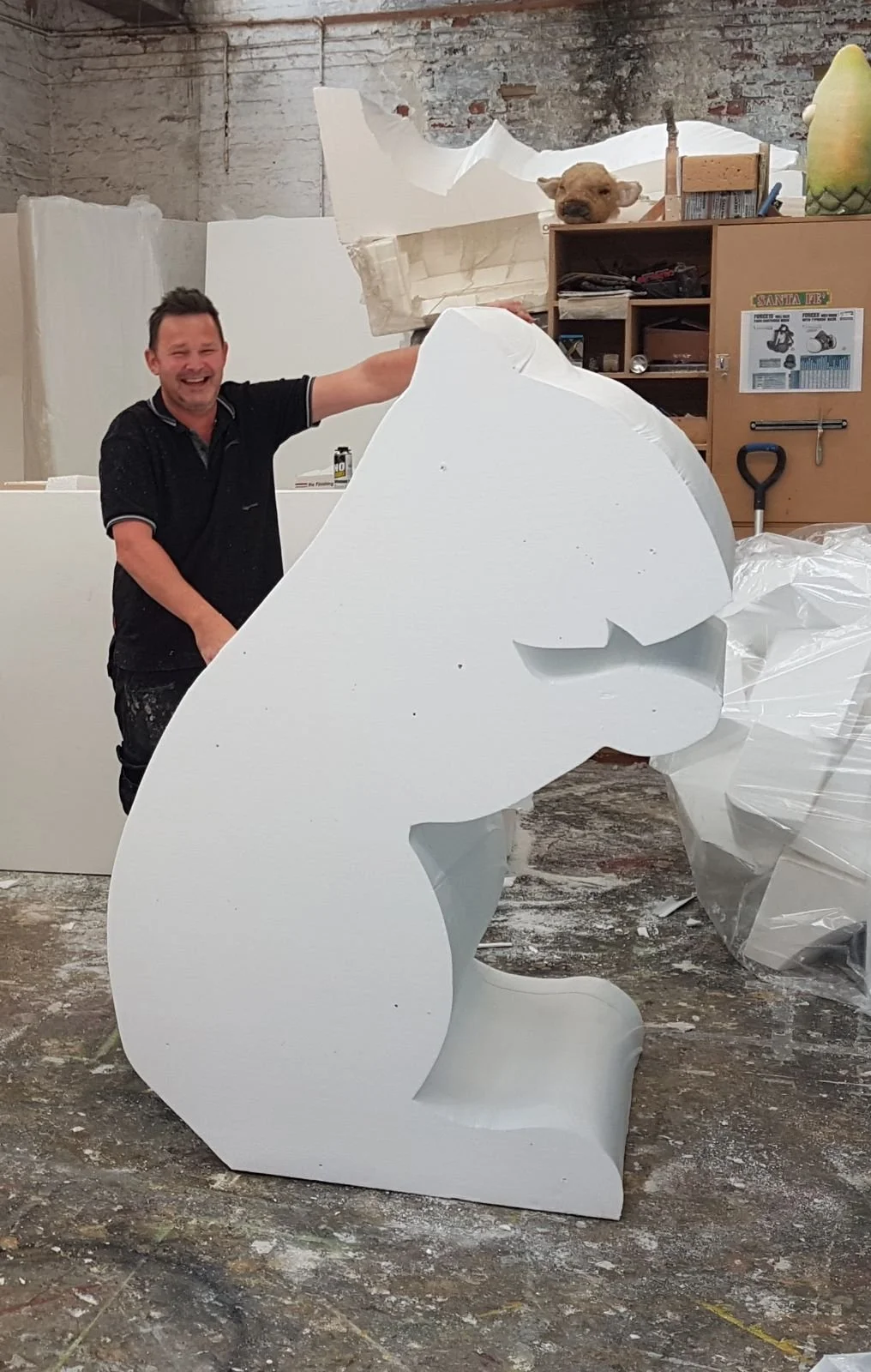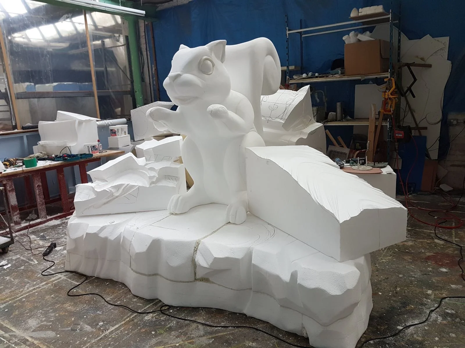 By dismantling the toy in several areas I was able to scale up the design. I started drawing the scaled design onto large blocks of HD polystyrene foam and proceeded to cut out the shape with an electric hotwire and carving tools.